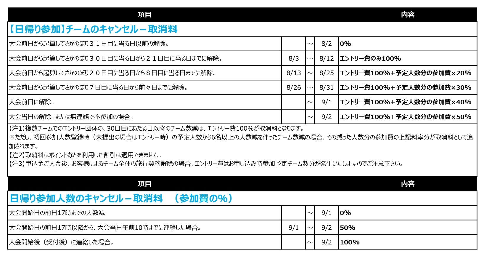 ■キャンセル料規定につきましては下記よりご確認ください。 ■大会競技規則につきましてはこちらよりご確認ください。 ■当社の企画するサッカー大会では、万が一の事故に備えて、各チームの参加形態(宿泊/日帰り)により国内旅行傷害保険もしくはレクリエーション保険に加入しております。 |